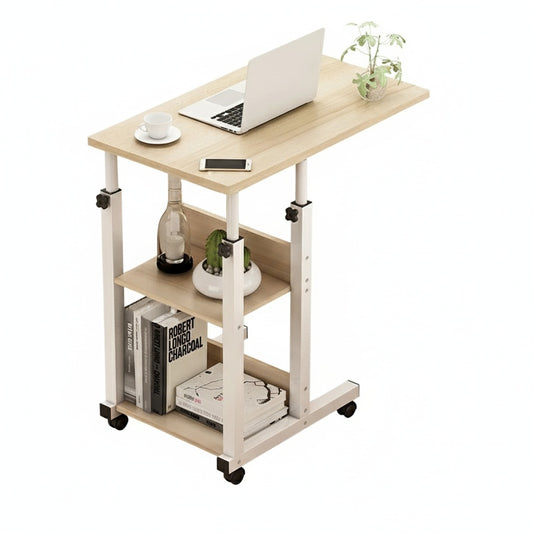 60 units Adjustable Mobile Laptop Desk with Bookshelf Storage, 3-Tier Rolling Study Table, Height Adjustable 26.8–33.5 in (68–85 cm), Compact Bedside Workstation for Bedroom, Living Room, Dorm, and Home Office