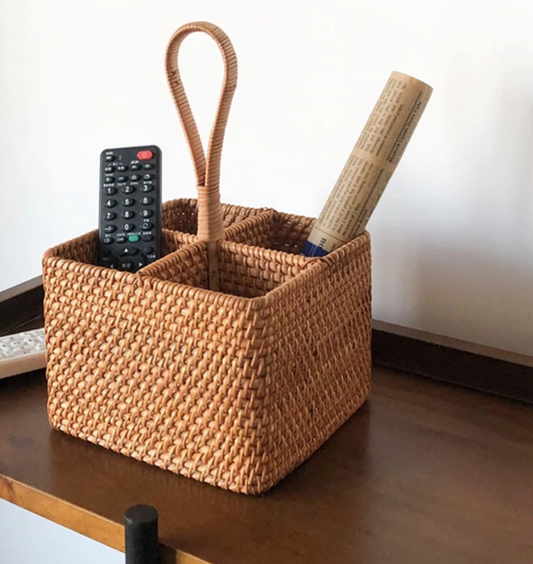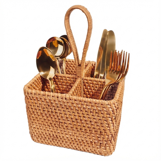 Rattan 4 Compartment Basket with Handle - Hold Utensils, Condiments, Bottles & More