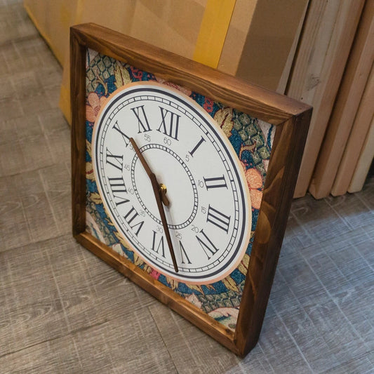 Floral Embroidery Print Wall Clock 13" x 13" - Vintage Style Wood Frame with Cotton Canvas