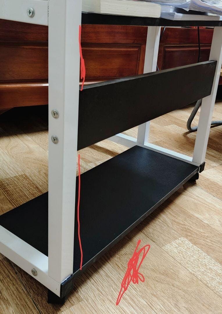 Product review: Overall, it looks similar to the picture, but the guard rail is way too high and not low enough, so it doesn't prevent books from falling; basically, it's useless. The edge of the table doesn't have a bumper around it, so it's quite sharp; it won't draw blood, but if you lean on it for a while, it will leave a mark and hurt a little. If you accidentally scrape along this edge, you might get a scratch.