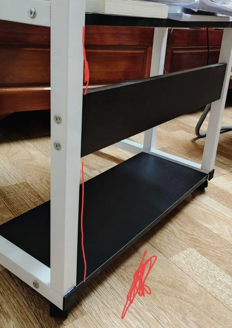 Product review: Overall, it looks similar to the picture, but the guard rail is way too high and not low enough, so it doesn't prevent books from falling; basically, it's useless. The edge of the table doesn't have a bumper around it, so it's quite sharp; it won't draw blood, but if you lean on it for a while, it will leave a mark and hurt a little. If you accidentally scrape along this edge, you might get a scratch.